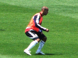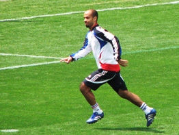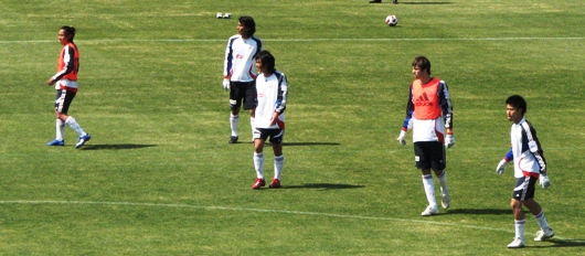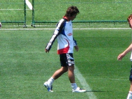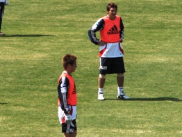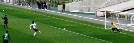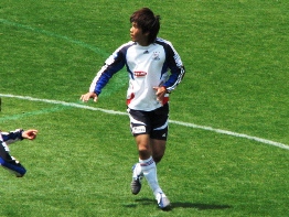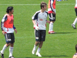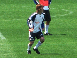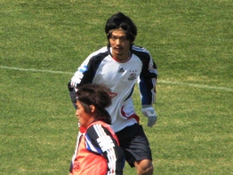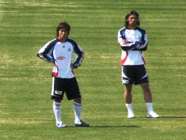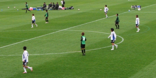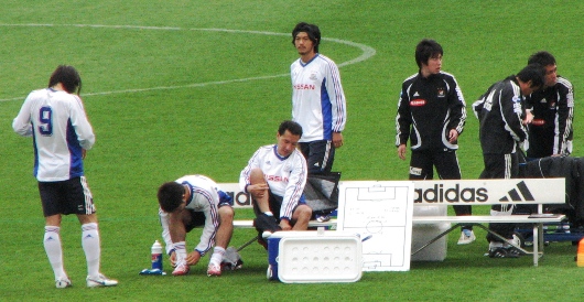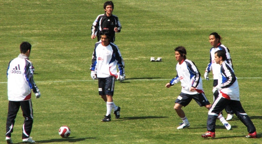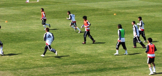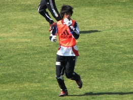 今日のトレーニングは、まず7人1組でゲーム感覚のドリブルやリフティングをしながらコーンの間を行き来するウォーミングアップが行われ、どの組もとても賑やかで、笑いに包まれる和やかなムード。その後、15分〜20分のランニング、ストレッチ、再度15分〜20分のランニングというメニューが行われた。ランニングでは中澤の後をくっ付いて走る天野に中澤がボールをぶつけたり、動きのフェイントをかけるなど客席の笑いを誘っていた。また、2本目のランニングではマルクスが最初からハイペースを維持し、コンディションは良さそうな印象を受けた。練習開始後しばらくして、リハビリ中の松田と秋元も姿を見せた。松田は前後左右の動きを交えながらボールを使ったリハビリメニューをこなしていたので、開幕に照準を合わせているかもしれない。